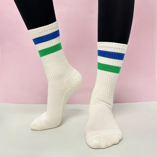 Grip socks provide better traction, stability, and balance, helping you stay secure during workouts. They also keep your feet protected from germs and are required at many studios—so having your own pair is a must!